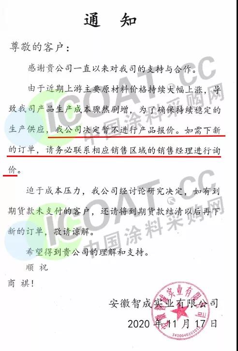 11月17日,安徽智成實業發函,稱由于近期上游原材料價格持續大幅上漲,導致產品生產成本驟然劇增,決定暫不進行產品報價。如需下新的訂單,請務必聯系相應銷售區域的銷售經理進行詢價。