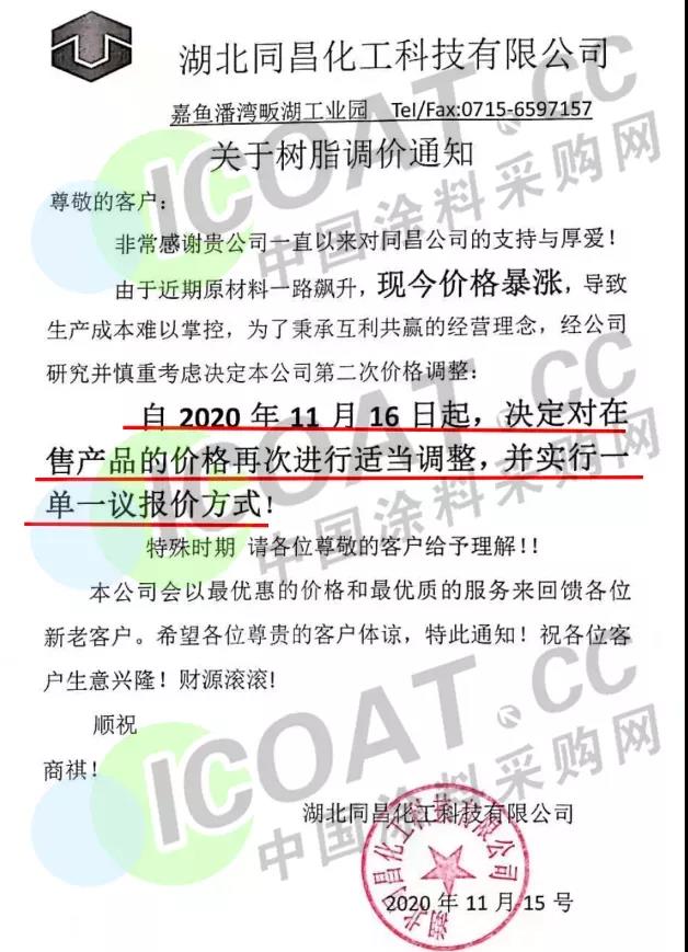 11月15日,湖北同昌化工科技有限公司發布關于樹脂調價的通知,稱16日起,決定對在售產品的價格再次進行適當調整,并實行一單一議報價方式。