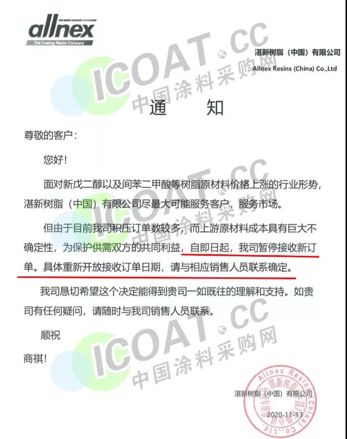 11月13日,湛新樹脂發函,稱由于積壓訂單數較多,上游原材料成本具有巨大不確定性,即日起暫停接收新訂單。具體重新開放接收訂單日期,請與銷售人員聯系確定。