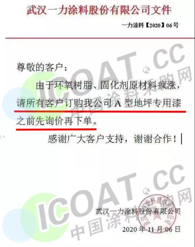 11月6日,武漢一力涂料股份有限公司發函,稱由于環氧樹脂、固化劑原材料瘋漲,請所有客戶訂購A型地坪專用漆之前先詢價再下單。