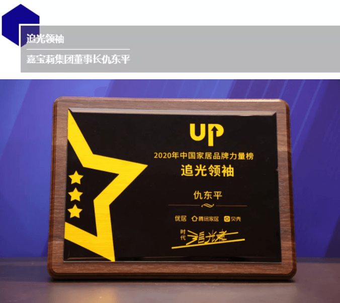 基于其年輕、創變、果敢的領導風格,仇東平女士榮獲2020年中國家居品牌“追光領袖”稱號。“追光領袖”代表了嘉寶莉人不忘初心,敢于創新的“追光精神”。正是嘉寶莉人敢于“追光”,嘉寶莉才能持續為用戶創造更大價值。特殊的2020年即將過去,如何在2021突破發展,實現絕對增長,是每個企業共同的議題。嘉寶莉以實力打造產品,以品質贏得口碑,面對時代的變革,不斷深耕質量,運用環保新科技,傳遞品牌價值,創造社會價值。未來,嘉寶莉將以此峰會榮獲的獎項為動力,為人們營造更多美好生活空間。