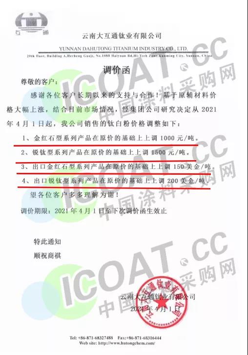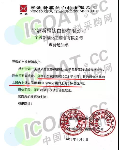 寧波新福鈦白粉有限公司發布漲價通知稱:自4月1日起,金紅石型鈦白粉在原價基礎上上調1000元/噸,出口價上調150美元/噸。