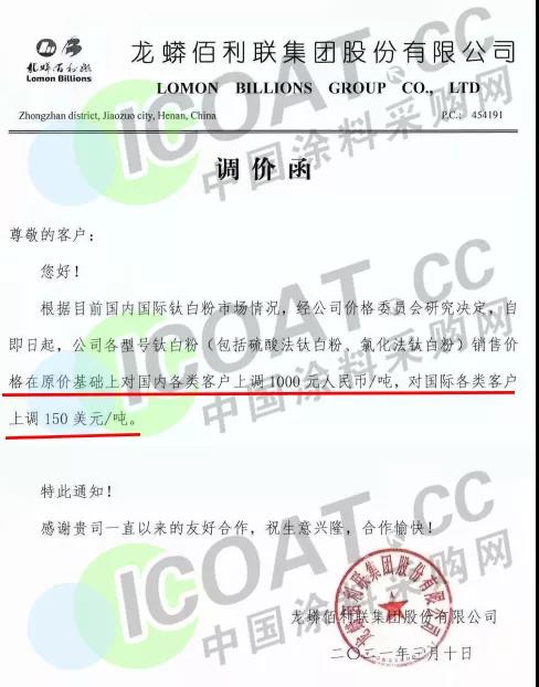 龍蟒佰利:各型號鈦白粉對國內各類客戶上調1000元/噸,國際各類客戶上調150美元/噸。