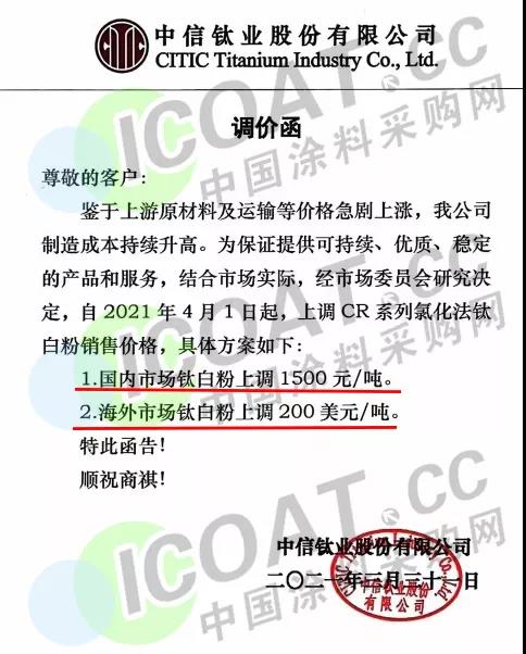 中信鈦業:4月1日起,國內鈦白粉上調1500元/噸,海外鈦白粉上調200美元/噸。