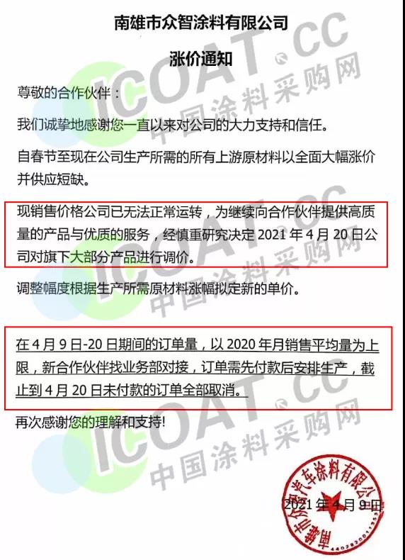 漲價函一出,在網絡和市場上瘋傳,產品漲價、限量銷售,還要先付款后安排生產,指定日期之前未付款訂單就取消了,著實令人震驚。涂料采購網與涂料上下游企業溝通時發現,這種情況不僅真實存在,而且在目前市場的瘋狂現狀下,更夸張更令人難以想象的事情也在發生。