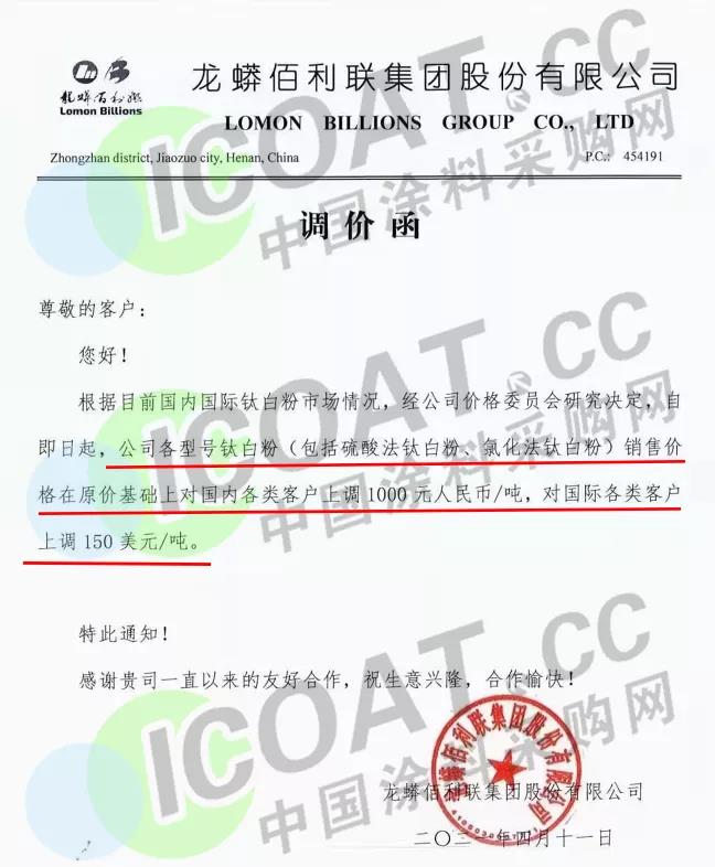 近日,鈦白粉龍頭企業(yè)龍蟒佰利發(fā)布調(diào)價函,稱即日(11日)起,各型號鈦白粉銷售價格在原價基礎(chǔ)上對國內(nèi)各類客戶上調(diào)1000元/噸,對國際各類客戶上調(diào)150美元/噸。