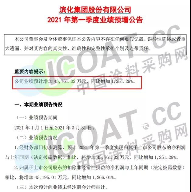 據涂料采購網不完全統計,目前公布2021年一季度報告或業績快報的化工行業上市公司中,有十幾家化企業績同比有所增長或預增,部分企業凈利潤預增幾十倍,多氟多凈利潤預增超過7100%,可以說在2021年實現了“開門紅”。