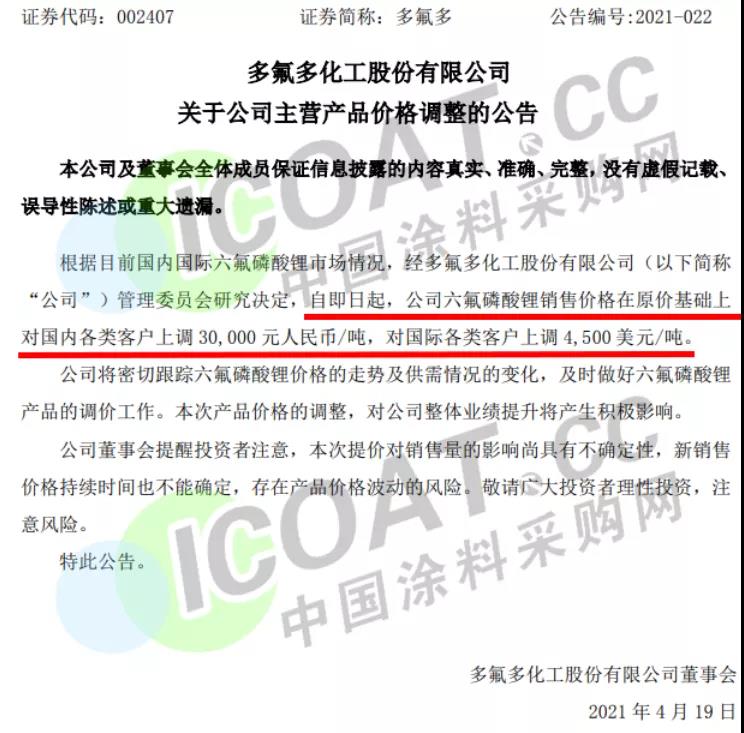 多氟多是氟化鹽生產制造的全球龍頭企業,也是國內首家實現鋰離子電池核心材料六氟磷酸鋰進口替代的企業。此前其曾預計2021年第一季度將實現歸屬于上市公司股東的凈利潤在9000萬元~9500萬元之間,同比增長7183.91%-7588.57%,原因是下游鋰電池需求旺盛,六氟磷酸鋰作為動力鋰電池電解液的核心材料,其價格提升明顯。據涂料采購網了解,隨著新能源汽車產銷量的高速增長,上游鋰電池產業鏈成了“香餑餑”,去年開始,國內鋰電池出貨量增長,而國內鋰電池行業所需的化工原材料也得到了較大的拉動,價格直線拉升。