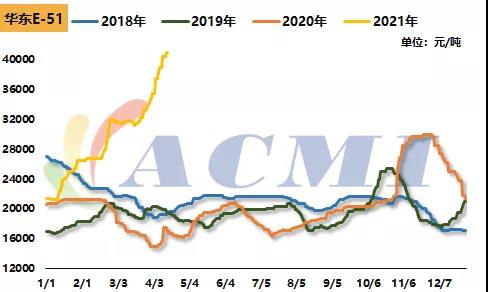 醋酸:目前華東地區醋酸報價7000元/噸上方,較年初上漲2700元/噸,漲幅62.79%。最主要的原因還是在于供需面的不平衡。醋酸下游新增主要集中在PTA行業,累計新增產能870萬噸/年,相當于理論上每年增加了約50萬噸的醋酸需求。而供應方面來看,2020年國內醋酸產能只有陜西延長擴產10萬噸/年,因此其供應支撐作用微乎其微。