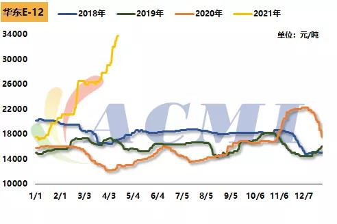丙烯酸:19日,萬華化學丙烯酸華北區域報價10400元/噸,較年初報價8000元/噸上調2400元/噸,漲幅30%;華東區域報價10500元/噸,較年初報價8100元/噸上調2400元/噸,漲幅29.63%。