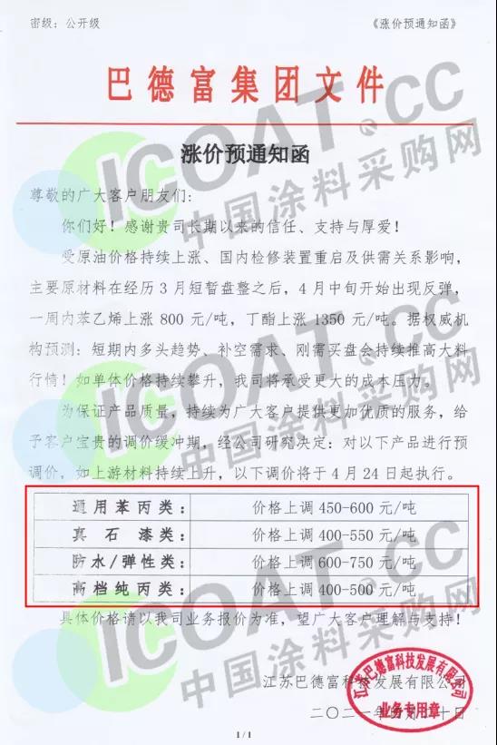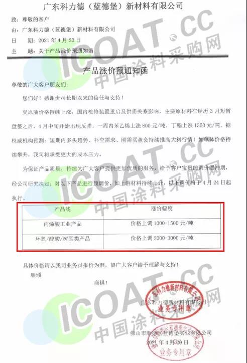 廣東科力德(藍德堡)新材料有限公司發函,稱丙烯酸工業產品價格上調1000-1500元/噸,環氧/醇酸/樹脂類產品價格上調2000-3000元/噸。