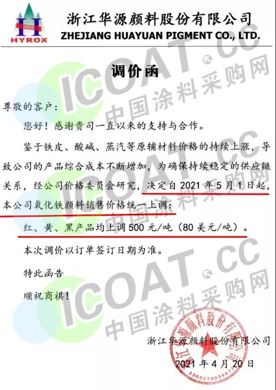 華源顏料發布調價函,決定自5月1日起,氧化鐵顏料銷售價格統一上調:紅、黃、黑產品均上調500元/噸(80美元/噸)。
