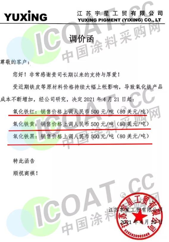 江蘇宇星工貿有限公司發布調價函,稱4月21日起,氧化鐵紅、氧化鐵黃、氧化鐵黑產品,銷售價格上調人民幣500元/噸(80美元/噸)。