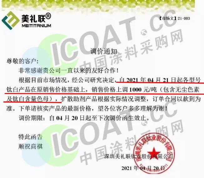 深圳美禮聯鈦業發函,稱4月21日起各型號鈦白產品在原銷售價格基礎上,銷售價格上調1000元/噸,擴散助劑產品根據實際情況調整。