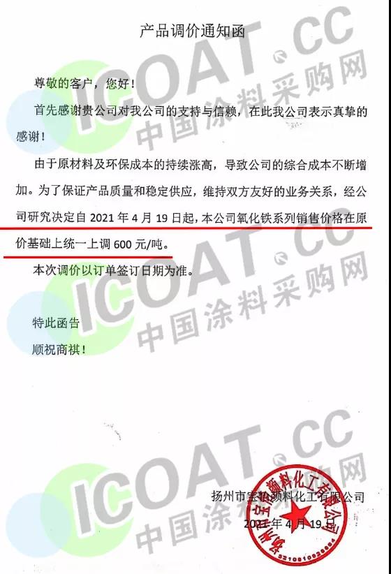 揚州市寶怡顏料化工發函,稱4月19日起,氧化鐵系列銷售價格在原價基礎上統一上調600元/噸。