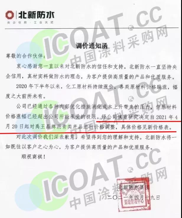 北新防水集團發函,稱4月20日起,對禹王品牌瀝青類產品進行價格調整,具體價格見新價格表。