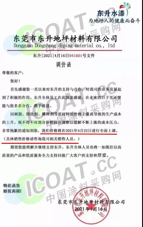 東莞市東升地坪材料發函,稱產品價格在4月22日進行全面上調,具體銷售價格請咨詢相關銷售人員。
