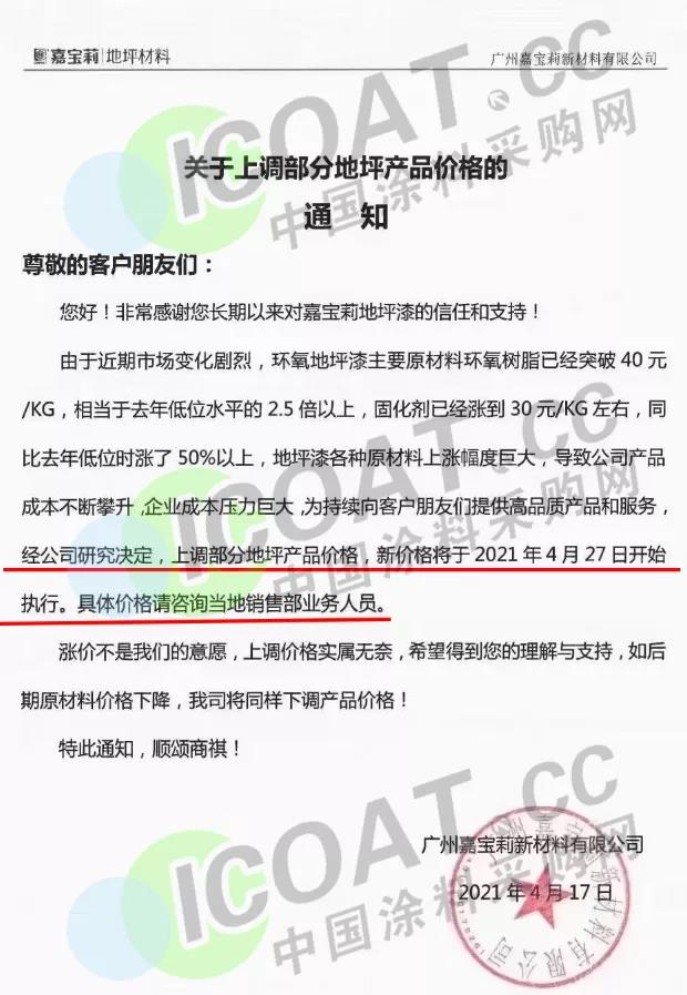 廣州嘉寶莉新材料發函,稱決定上調部分地坪產品價格,新價格將于4月27日開始執行。