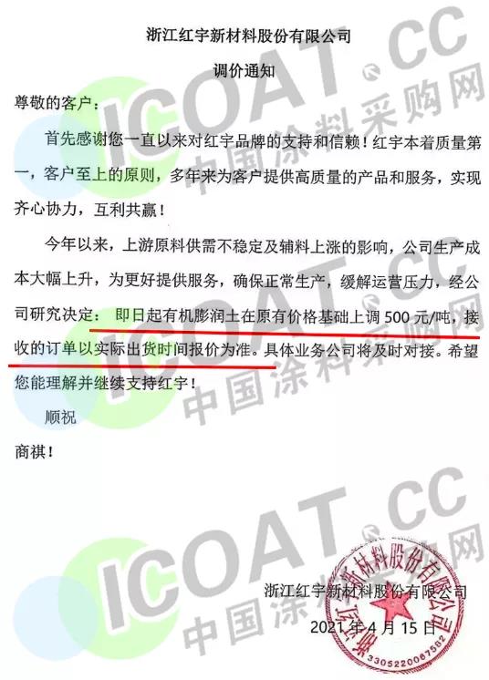 浙江紅宇新材料發函,稱即日(15日)起有機膨潤土在原有價格基礎上上調500元/噸。