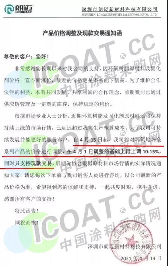 深圳市朗邁新材料發函,稱4月15日起,對環氧地坪全系列產品的價格進行調整,在4月1日調整的基礎上在上調10——15%,同時只支持現款交易。