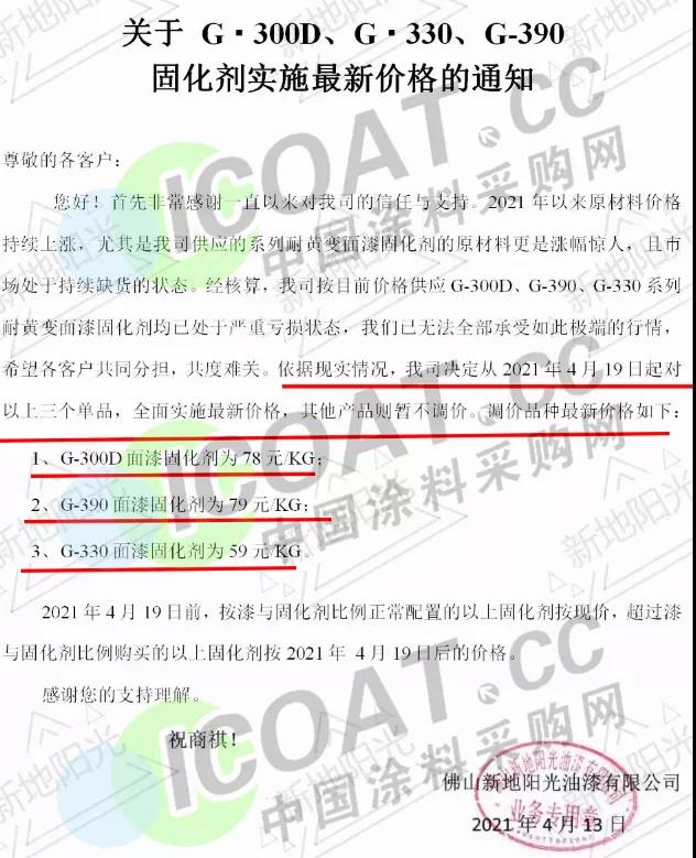 佛山新地陽光油漆發函,稱4月19日起,對三個單品全面實施最新價格。