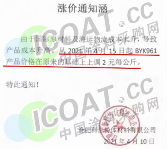 合肥科泰粉體材料發函,稱4月15日起BYK961產品價格在原來的基礎上上調2元/公斤(2000元/噸)。
