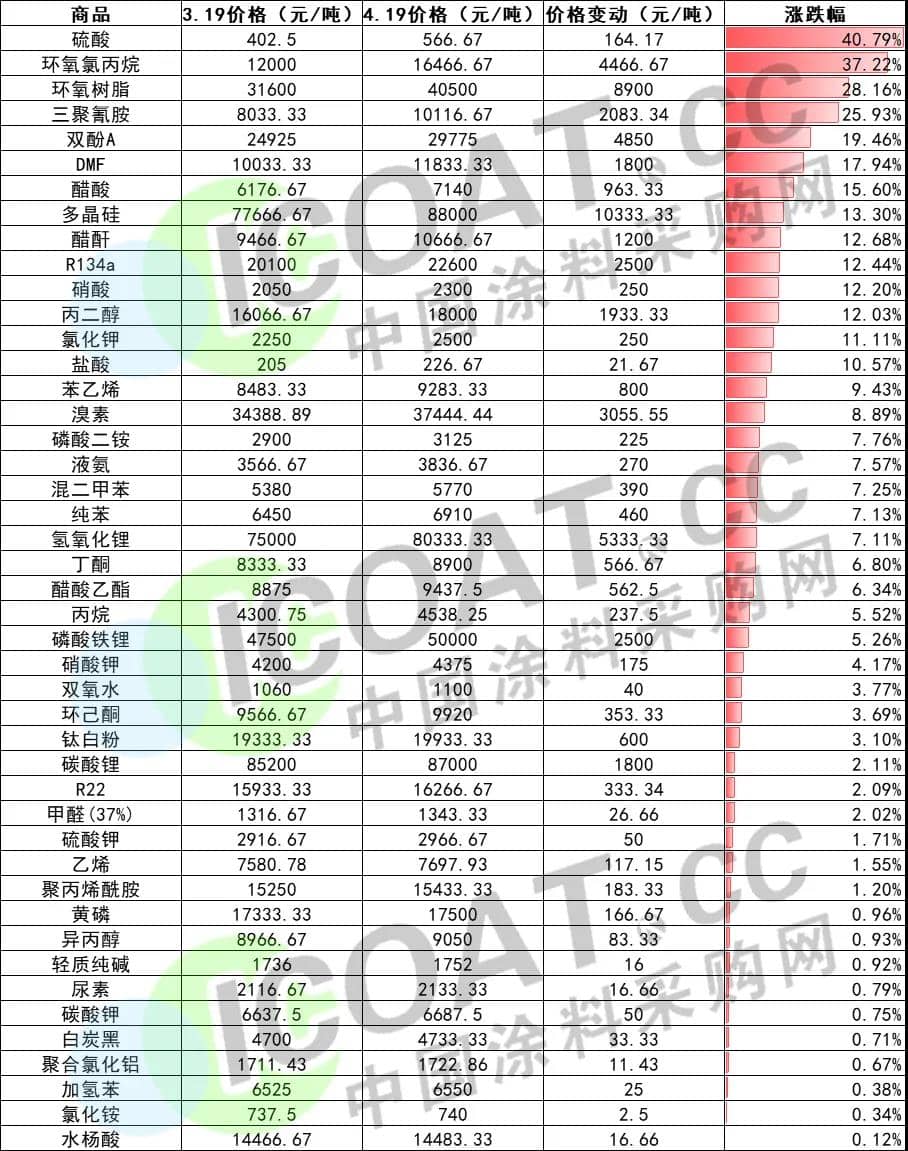 據涂料采購網了解,近期化工行業火爆異常,顏料、樹脂等化工品漲勢難停。多家化工企業發函宣布漲價,涉及到鈦白粉、顏料、乳液等眾多化工品。