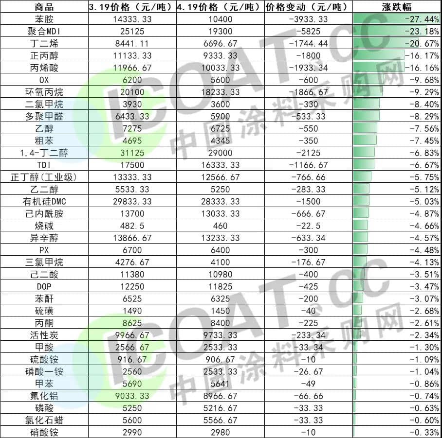 除此之外,正丙醇下跌1800元/噸,跌幅16.17%;丁二烯下跌1744.44元/噸,跌幅20.67%;有機硅下跌1500元/噸,跌幅5.03%;TDI下跌1166.67元/噸,跌幅6.67%……9種原材料價格下跌超過1000元/噸,16種原材料價格下跌超過100元/噸。