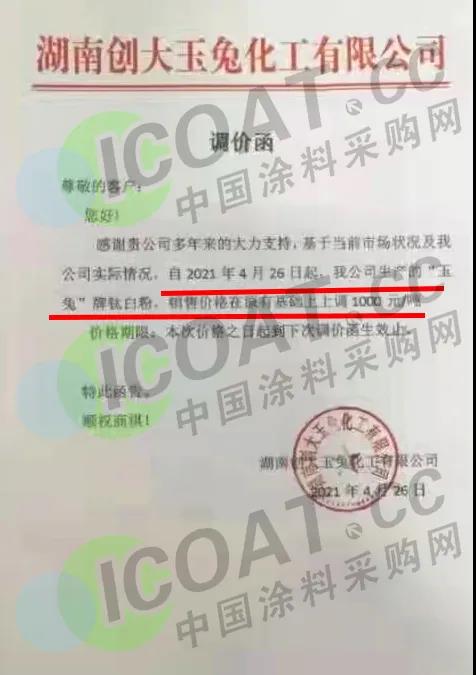 另外,鈦白粉龍頭科慕于近期宣布,5月1日起鈦白粉產品調漲200美元/噸(1299元/噸)漲價,另有業(yè)內人士表示,由于鈦白粉供不應求,海外部分鈦白粉大廠還會在5月份集體發(fā)函調漲一次,幅度約為200美元/噸左右,國內企業(yè)跟漲也將是意料之中的事情。