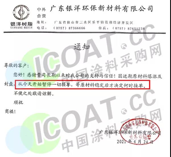 而在此前,廣東銀洋環(huán)保新材料有限公司發(fā)函,稱由于近期原材料暴漲及封盤,即日起暫停一切接單,等原材料穩(wěn)定后才決定何時接單。