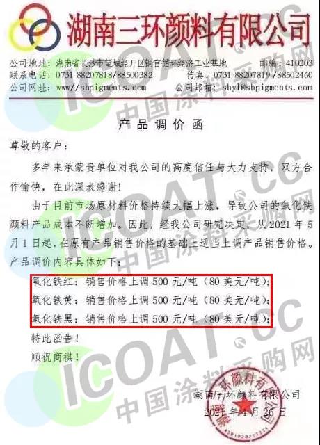 湖南三環(huán)顏料有限公司:經研究決定,從2021年5月1日起,適當上調產品銷售價格。氧化鐵紅、氧化鐵黃、氧化鐵黑銷售價格上調500元/噸(80美元/噸)。