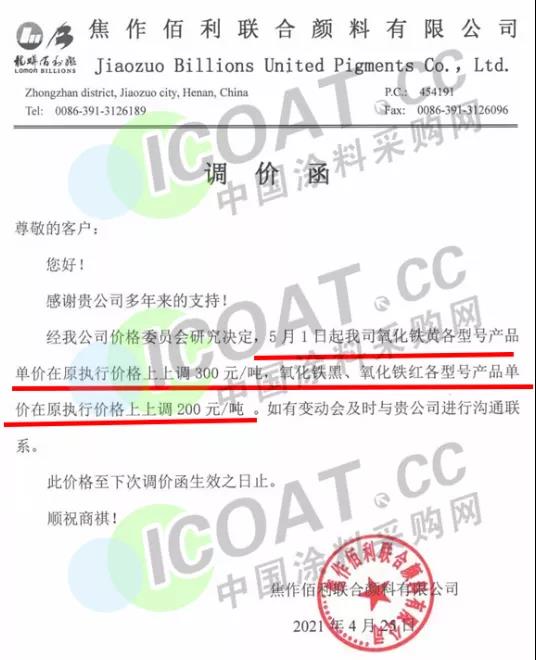 焦作佰利聯合顏料有限公司:經研究決定,5月1日起氧化鐵黃各型號產品單價在原執(zhí)行價格上上調300元/噸,氧化鐵黑、氧化鐵紅各型號產品單價在原執(zhí)行價格上上調200元/噸。