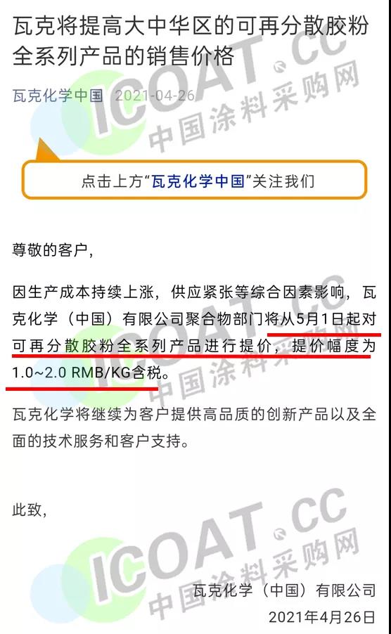 瓦克化學(中國)有限公司:聚合物部門將從5月1日起對可再分散膠粉全系列產品進行提價,提價幅度為1.0~2.0 RMB/KG(1000-2000元/噸)含稅。