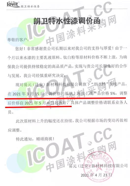 朗衛(wèi)特水性漆:現對易元(遷安)新材料科技有限公司旗下“朗衛(wèi)特”全線產品在2021年3月15日上調價格的基礎上再次上調產品價格5%,調整后價格自2021年5月6日起執(zhí)行,具體產品調整價格請聯系業(yè)務人員。