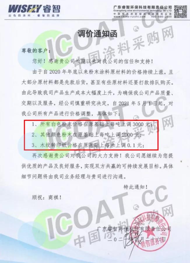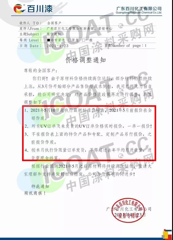 除此之外,部分涂料企業(yè)也通過客戶群、微信群等通知了5月漲價情況,提醒客戶根據庫存合理備貨,并及時支付貨款。目前已經出現產品售價與成本倒掛的情況,眾多企業(yè)表示無力獨自承擔,只能選擇漲價。