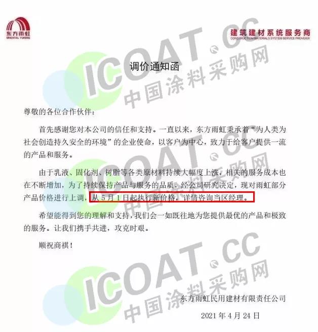 東方雨虹民用建材有限責任公司:經研究決定,對雨虹部分產品價格進行上調,從5月1日起執(zhí)行新價格,詳情咨詢當區(qū)經理。