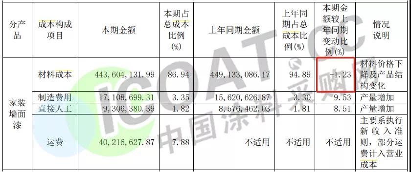 除了乳液、鈦白粉、助劑、溶劑、瀝青價格同比下調最高達21.88%外,在家裝墻面漆方面,2020年度三棵樹材料成本約為4.43億元,同比減少1.23%,原因為材料價格下降及產品結構變化。
