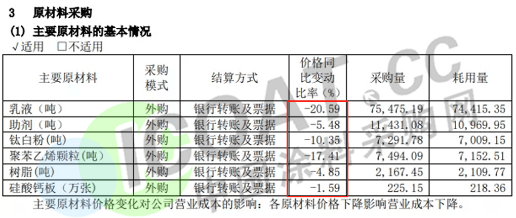 亞士創能2020年度年報顯示,主要原材料采購模式為外購,結算方式為銀行轉賬及票據,價格同比下調最高20%左右。其中乳液價格同比下調20.59%;助劑價格同比下調5.48%;鈦白粉價格同比下調10.35%;聚苯乙烯顆粒價格同比下調17.41%;樹脂價格同比下調4.85%;硅酸鈣板價格同比下滑1.59%。