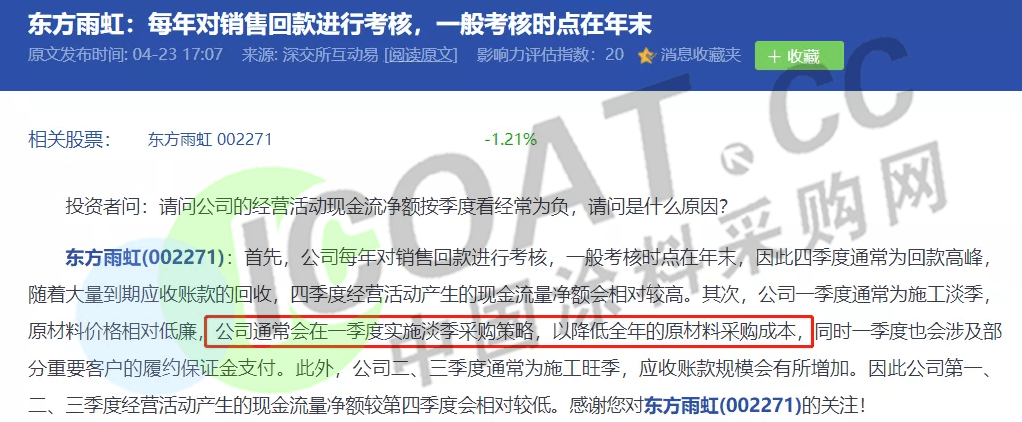 此前東方雨虹在回復投資者提問時曾表示,公司一季度通常為施工淡季,原材料價格相對低廉,公司通常會在一季度實施淡季采購策略,以降低全年的原材料采購成本。