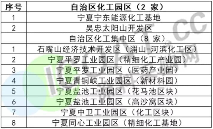寧夏回族自治區(qū)2家化工園區(qū)+8家化工集中區(qū)