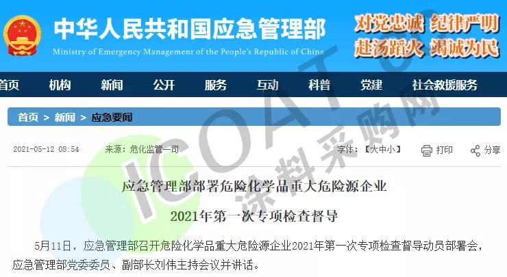 與此同時,15日應急管理部發布信息,稱為防控危化品重大安全風險,以及為慶祝建黨100周年營造安全穩定環境,應急管理部派出6個工作組,赴北京、天津、河北、山東、江蘇等14個重點省份開展危化品重大危險源企業專項督導核查。