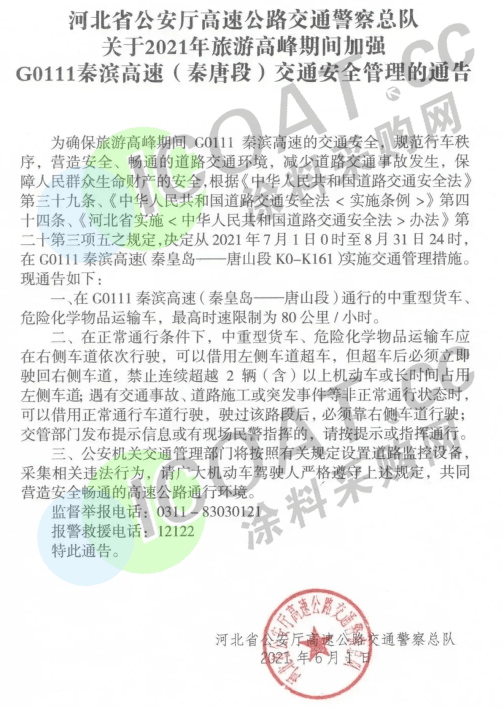 河北省公安廳高速公路交通警察總隊:決定從2021年7月1日0時---8月31日24時,在G0111秦濱高速(秦皇島——唐山段K0-K161)實施交通管理措施。在G0111秦濱高速(秦皇島——唐山段)通行的中重型貨車、危險化學物品運輸車,最高時速限制為80公里/小時。
