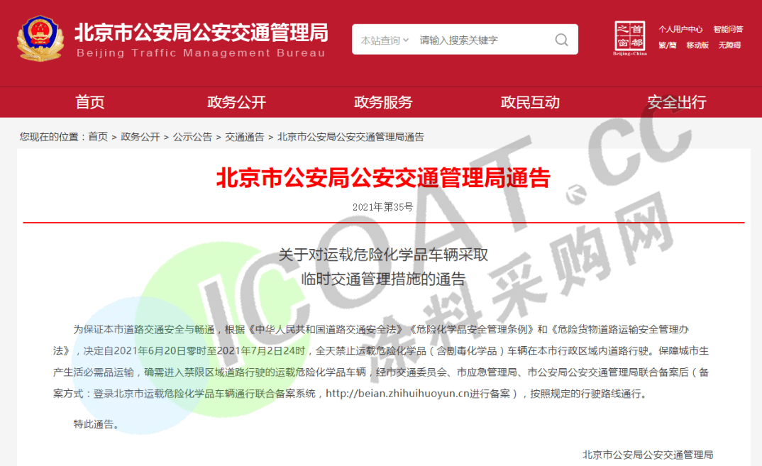 北京市公安局公安交通管理局通告:決定自2021年6月20日零時至2021年7月2日24時,全天禁止運載危險化學品(含劇毒化學品)車輛在本市行政區域內道路行駛。