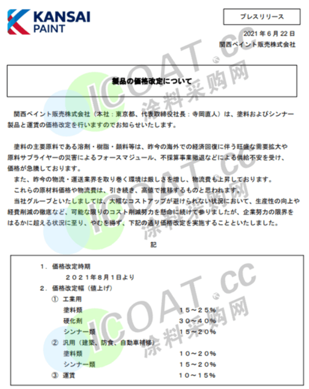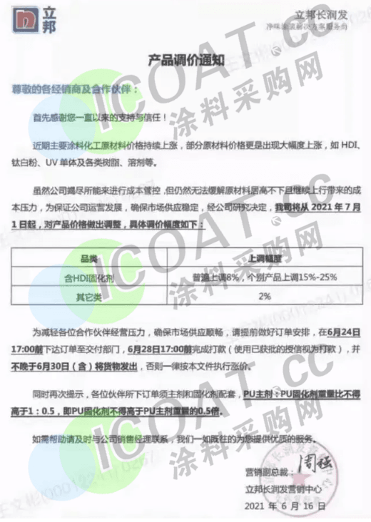 立邦長(zhǎng)潤(rùn)發(fā)涂料:自2021年7月1日起,含HDI固化劑產(chǎn)品價(jià)格普遍上調(diào)8%,個(gè)別產(chǎn)品上調(diào)15%~25%,其它類產(chǎn)品上漲2%。