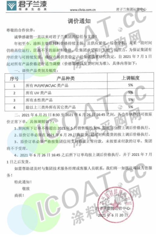 君子蘭漆發(fā)布調(diào)價(jià)通知稱,自2021年7月1日起對(duì)所有產(chǎn)品價(jià)格進(jìn)行適當(dāng)調(diào)整(價(jià)格調(diào)整以發(fā)貨時(shí)間為準(zhǔn)),所有 PU\PE\NC\AC 類產(chǎn)品上調(diào)5%;所有 UV 類產(chǎn)品上調(diào)5%;所有水性類產(chǎn)品上調(diào)5%;除以上三類外所有其它類產(chǎn)品上調(diào)5%。此外,君子蘭表示,2021年6月21日8:30至2021年6月26日16:45 之間,各合作伙伴仍可按原價(jià)正常下單,具體規(guī)則為,下訂單不得超出2021年5月銷售額的 30%,超出部分按上調(diào)后價(jià)格執(zhí)行。原價(jià)訂單必須在2021年6月29日前提貨,超過時(shí)間提貨的按上調(diào)后價(jià)格執(zhí)行。原價(jià)訂單必須嚴(yán)格按集團(tuán)信用支持政策正常付款,未按要求付款的訂單,集團(tuán)將不予受理。2021年6月26日16:45之后所下訂單均按上調(diào)后價(jià)格執(zhí)行,并于2021年7月1日之后發(fā)貨。