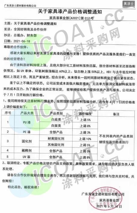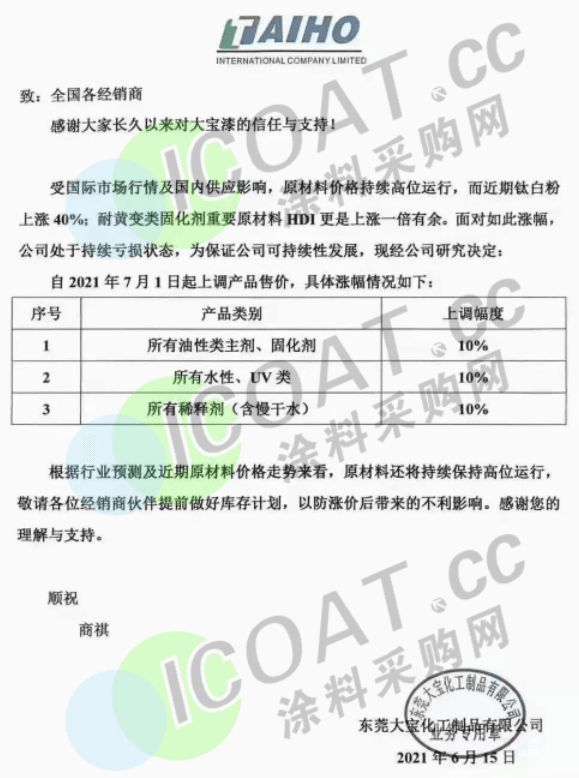 大寶漆:經(jīng)研究決定,自2021年7月1日起上調(diào)產(chǎn)品售價(jià)。所有油性類助劑、固化劑價(jià)格上漲10%,所有水性、UV類涂料價(jià)格上漲10%,所有稀釋劑價(jià)格上漲10%。