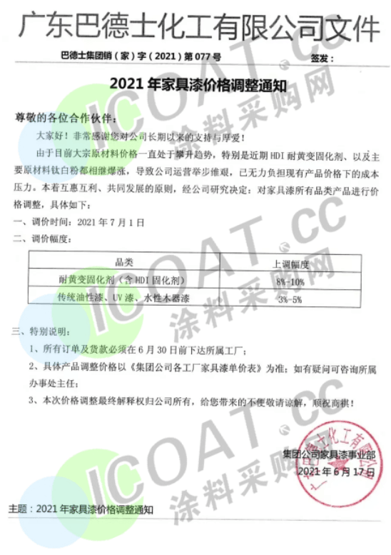 廣東巴德士化工有限公司:經(jīng)研究決定,對(duì)家具漆所有品類產(chǎn)品進(jìn)行價(jià)格調(diào)整,調(diào)價(jià)時(shí)間為2021年7月1日。調(diào)價(jià)幅度為,耐黃變固化劑(含HDI周化劑)上調(diào) 8%-10%;傳統(tǒng)油性漆、UV漆、水性木器漆上調(diào)3%-5%。