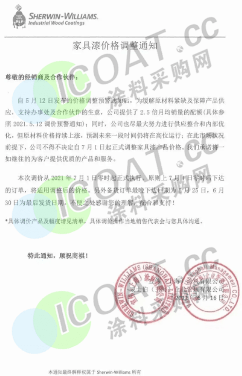 宣偉威士伯:原材料價(jià)格持續(xù)上漲,預(yù)測(cè)未來一段時(shí)間仍將在高位運(yùn)行,決定自7月1日起正式調(diào)整家具漆產(chǎn)品價(jià)格。原則上7月1日零時(shí)后下達(dá)的訂單,將適用調(diào)整后的價(jià)格。
