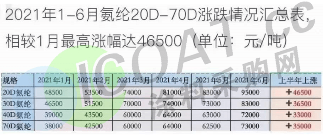 2021開年以來,多種化工品價格持續暴漲且供應短缺大有愈演愈烈的趨勢。紡織化工的原材料氨綸產品40D報價已高達71100元/噸,年內累計漲幅130.1%,而一個月漲三次的架勢也讓下游客戶難以消化,堪稱原料界的“黑馬”。氨綸價格的飆升自然離不開下游行情火爆帶來的拉動。一方面其作為重要防疫物資口罩的原材料,供不應求的情況已經持續良久;另一方面,受疫情影響,人們對于衣著類服飾舒適度需求進一步提升,作為輕薄舒適質感彈性面料的重要原料,氨綸的需求也受到了極大的拉動。