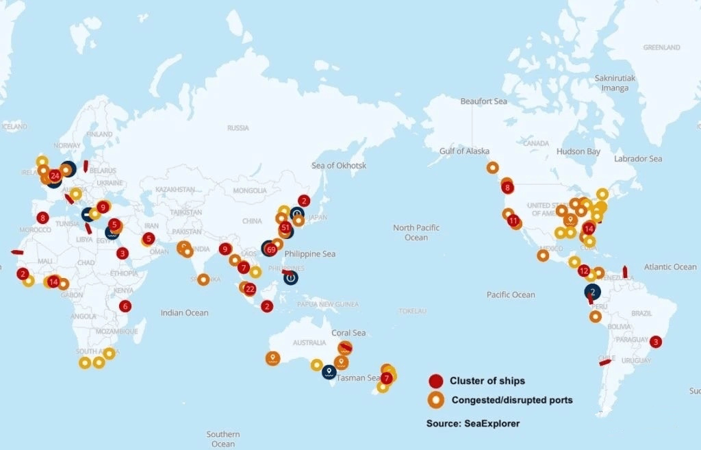 紅色代表船只集群,橙色代表擁擠或運營中斷的港口